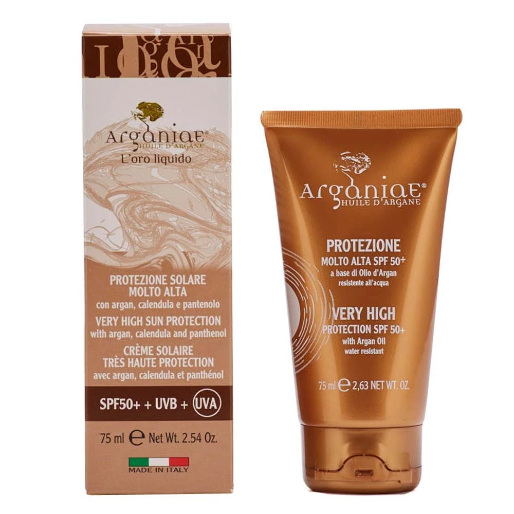 Die Arganiae Sonnencreme mit sehr hohem Schutz LSF 50+ auf Basis von Arganöl mit sehr hohem Schutz mit Arganöl bietet einen sehr hohen Schutz vor den UVA-/UVB- Strahlen. Sie enthält ein aktives System mit doppelter Wirkung: Ausgezeichneter Schutz vor den UVB- und UVA- Sonnenstrahlen und Schutz des Hydrolipidfilms. In dieser Creme ist Arganöl enthalten, mit einem hohen Anteil an ungesättigten Fettsäuren, Linolsäure und Vitamin E, um die Lebensfunktionen der Zellen zu stimulieren und die Hautbasis zu restrukturieren.