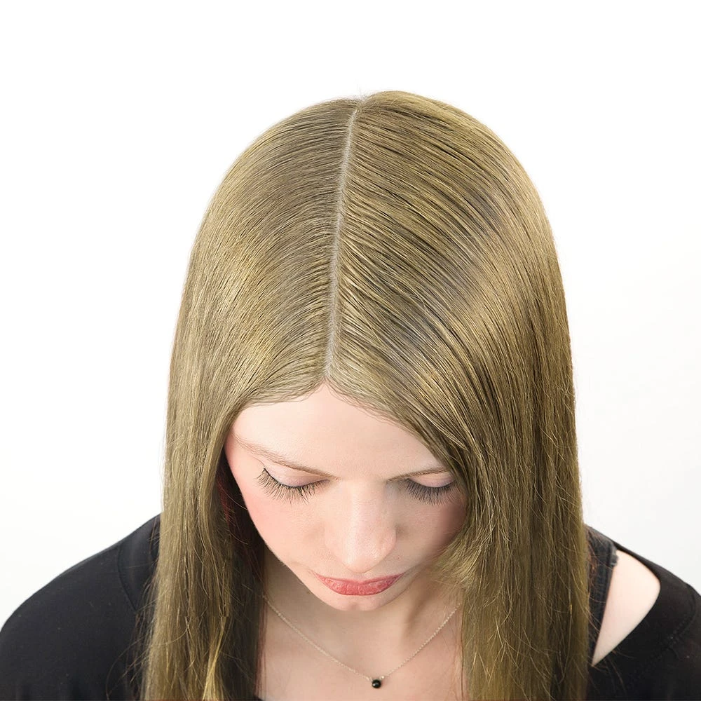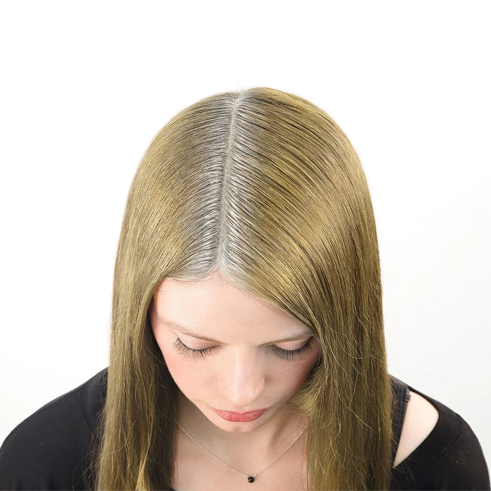 Haarpartie am Ansatz straffen. Beginnend am Haaransatz in Richtung Haarspitze das Puder großzügig mit schmaler Pinselseite tupfend auftragen und bei Bedarf wiederholen. Puder ein paar Minuten einwirken lassen. Eventuelle Rückstände mit breiter Pinselseite abstreichen.