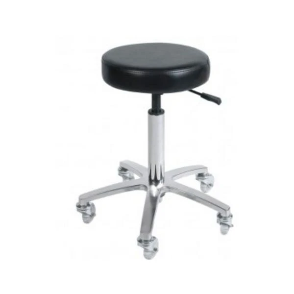 Höhenverstellbarer Rollhocker mit gummierten Laufrollen.