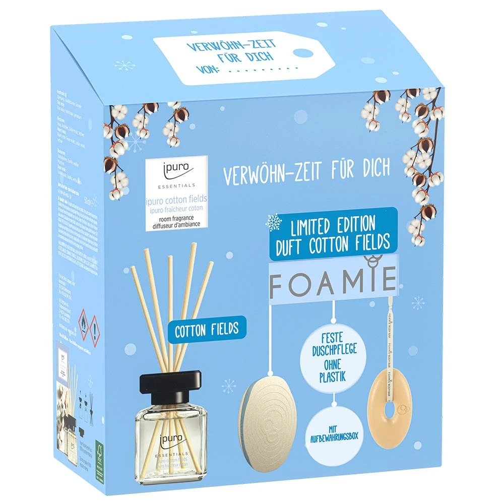 Das FOAMIE & Ipuro Verwöhnset verwandelt jedes Bad in eine Wellness-Oase. Dem Alltag entfliehen und sich selbst verwöhnen. Foamie & Ipuro ergänzen sich rund um das Thema nachhaltige Verwöhn-Pflege perfekt in diesem Set: FOAMIE feste Duschpflege limited Edition Cotton Fields inkl. praktischer Aufbewahrungsbox (auch für unterwegs) und Ipuro Raumduft Bestseller Cotton Fields Für maximale Entspannung und belebte Sinne im Badezimmer.