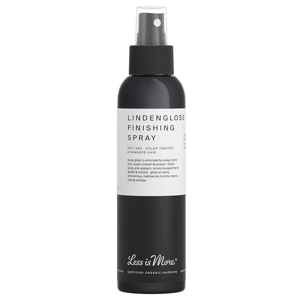Das 2-Phasen Glanzspray LESS IS MORE Lindengloss Finishing Spray glättet sprödes, strukturgeschädigtes Haar, verleiht Geschmeidigkeit, wirkt antistatisch und beugt Austrocknen, Ausbleichen und UV-Schäden vor. Der rein organische Anti-Aging Glanzkomplex mit Lindenmet, Cistrosenextrakt, Weizenkeimöl und Macrolobaöl – reich an hochwirksamen Lipiden und Anti-Oxidantien – wird abgerundet durch das elegante Aroma von Lindenblütenwasser* und reinster ätherischer Öle von Petitgrain Bigarade und Douglasie. Für gefärbtes, blondiertes, chemisch behandeltes und strapaziertes Haar.