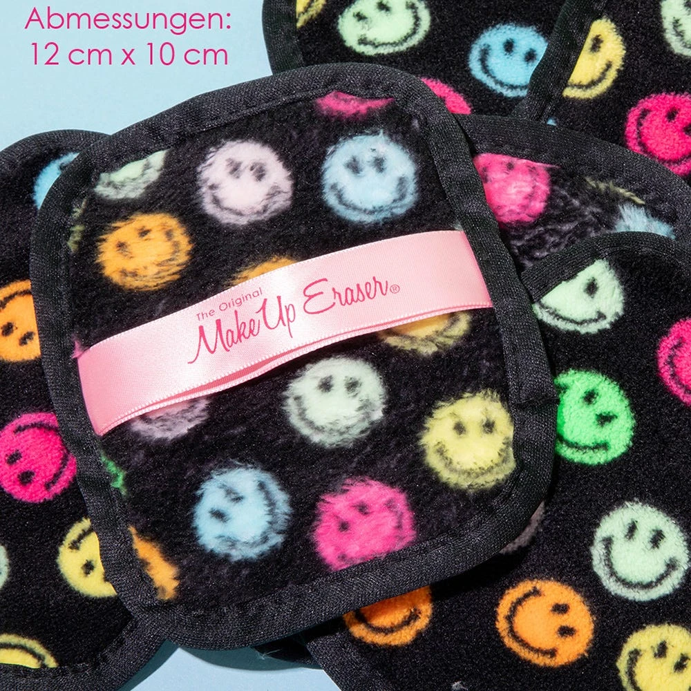 - enthält 7 Make-Up Eraser Pads,die mit neonfarbenen Smileys bedruckt sind