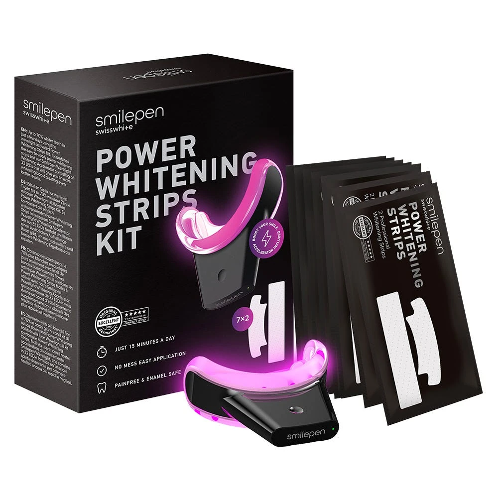 Das SmilePen Power Whitening Kit kombiniert die stärksten Zahnaufhellungsstreifen auf dem Markt mit dem innovativen UV450 Wavelight Accelerator – für maximale Aufhellungsergebnisse. Die einzigartige PAP Bleaching Formel mit Hydroxylapatit stärkt den Zahnschmelz, gleichzeitig sorgt Hyaluronsäure dafür, dass das Zahnfleisch gesund bleibt und gegen Reizungen geschützt wird. Maximale Zahnbleaching Resultat und bis 14 Stufen weissere Zähne, schneller, kabellos und mit dem stärksten Power Bleaching Gel für Ergebnisse wie beim Zahnarzt, garantiert ohne Schmerzen. Verfärbungen der Zähne werden mit unserer patentierten WaveLight Zahn Whitening LED-Technologie effektiv, aber vor allem schonend und schmerzfrei entfernt. Inhalt: 7× Smilepen Power Whitening Strips, 1 x Smilepen Power Whitening Accelerator Wireless, 1 x Ladekabel.