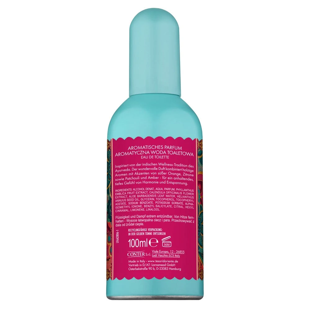 Das Tesori d´ Oriente Eau de Toilette Ayurveda wurde in Anlehnung an die indische Lebensphilosophie kreiert, um das innere Gleichgewicht zwischen Körper und Geist wiederherzustellen. Besonders pflegende und regenerierende Inhaltsstoffe wie Amla-Fruchtextrakt, Sesam-Öl sowie Aloe vera und Calendula sorgen für ein sinnliches Dufterlebnis und ein Gefühl der Entschleunigung. Die sorgfältige Komposition aus süßer Orange, Zitrone, Bergamotte sowie würzigen Noten, Veilchen, Iris und Ylang-Ylang, abgerundet durch Patchouli, Zedernholz und Amber, verführt die Sinne und schenkt Dir ein intensives Gefühl des Wohlbefindens und der Harmonie. Das Parfüm ist ein erstklassiger Begleiter für jeden Tag. Der leichte Aluminiumflakon sorgt nicht nur für einen stilvollen Look, sondern ist auch praktisch für Ihre Handtasche. So kannst Du es überallhin mitnehmen und es jederzeit auftragen. Dank elegantem Design und handlicher Größe– auch ideal als Geschenk für die Liebsten.