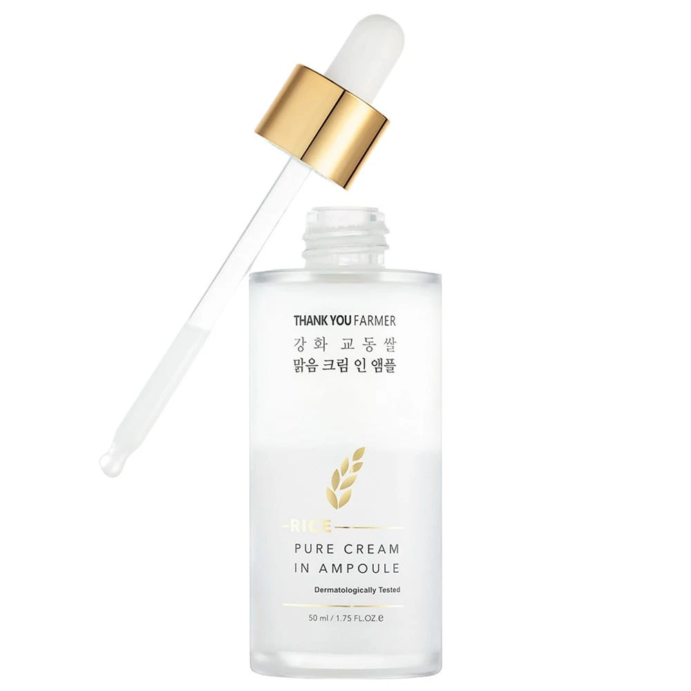 Die Thank You Farmer Rice Pure Cream In Ampoule mit einer wertvollen Rezeptur aus Reis-Extrakt, die den Hautton verbessert, strafft und weich macht. Idealer Hauttyp: Trocken/empfindlich