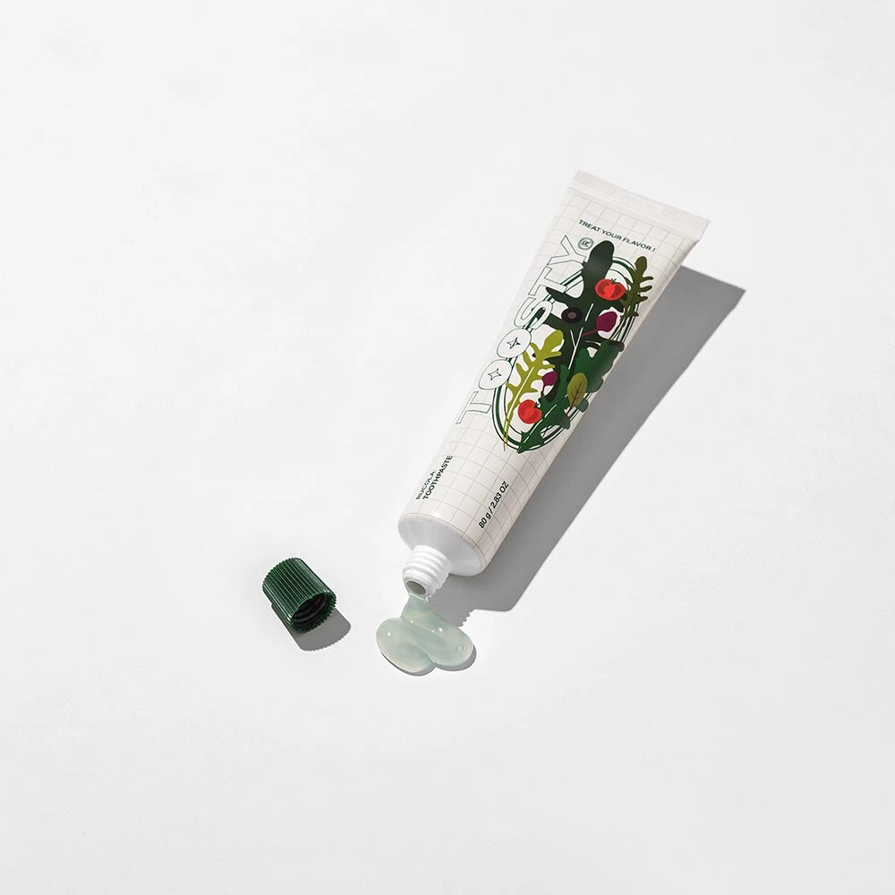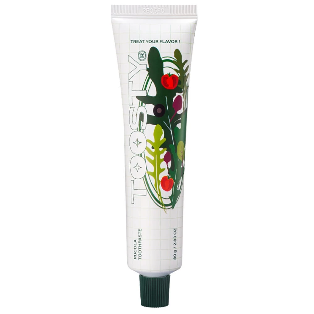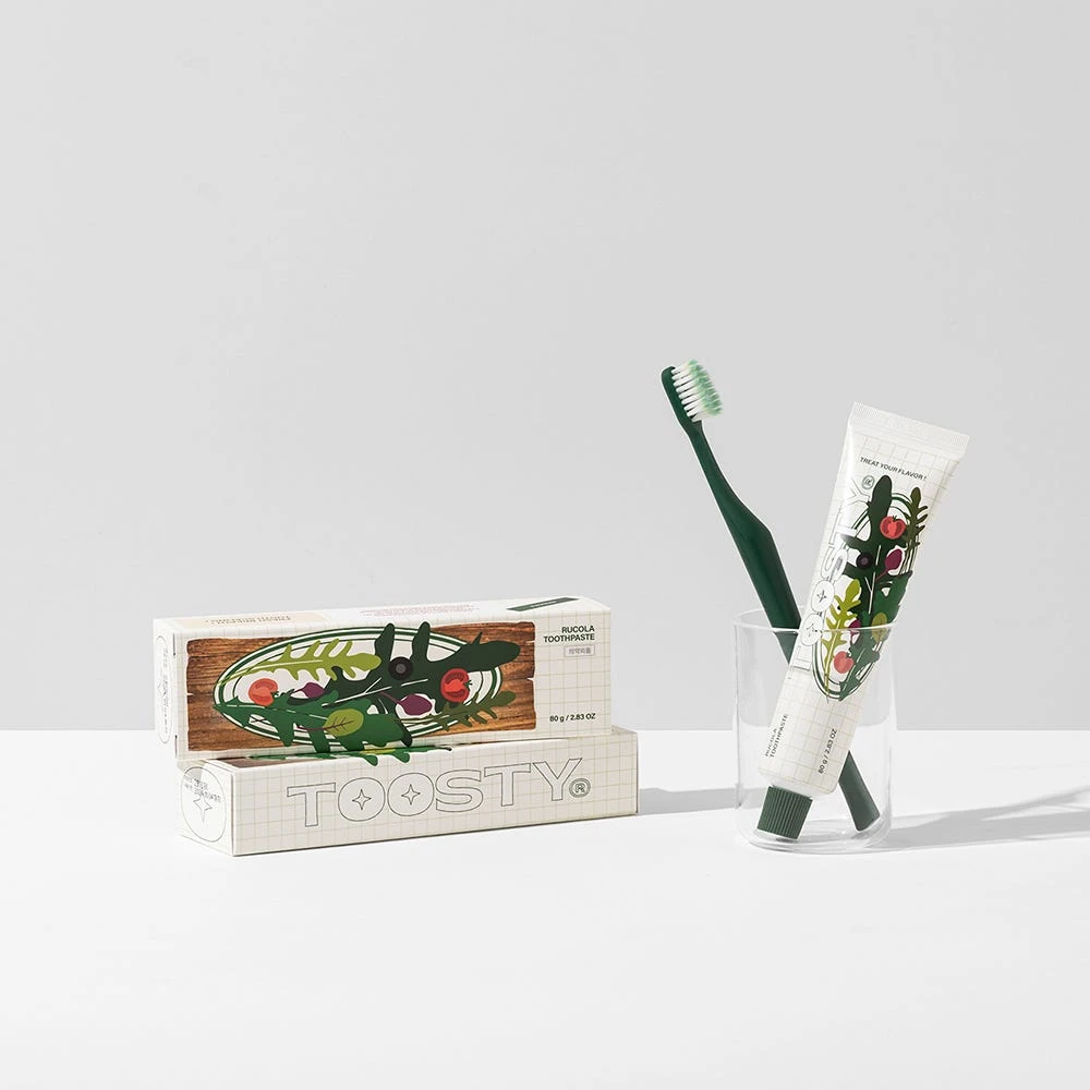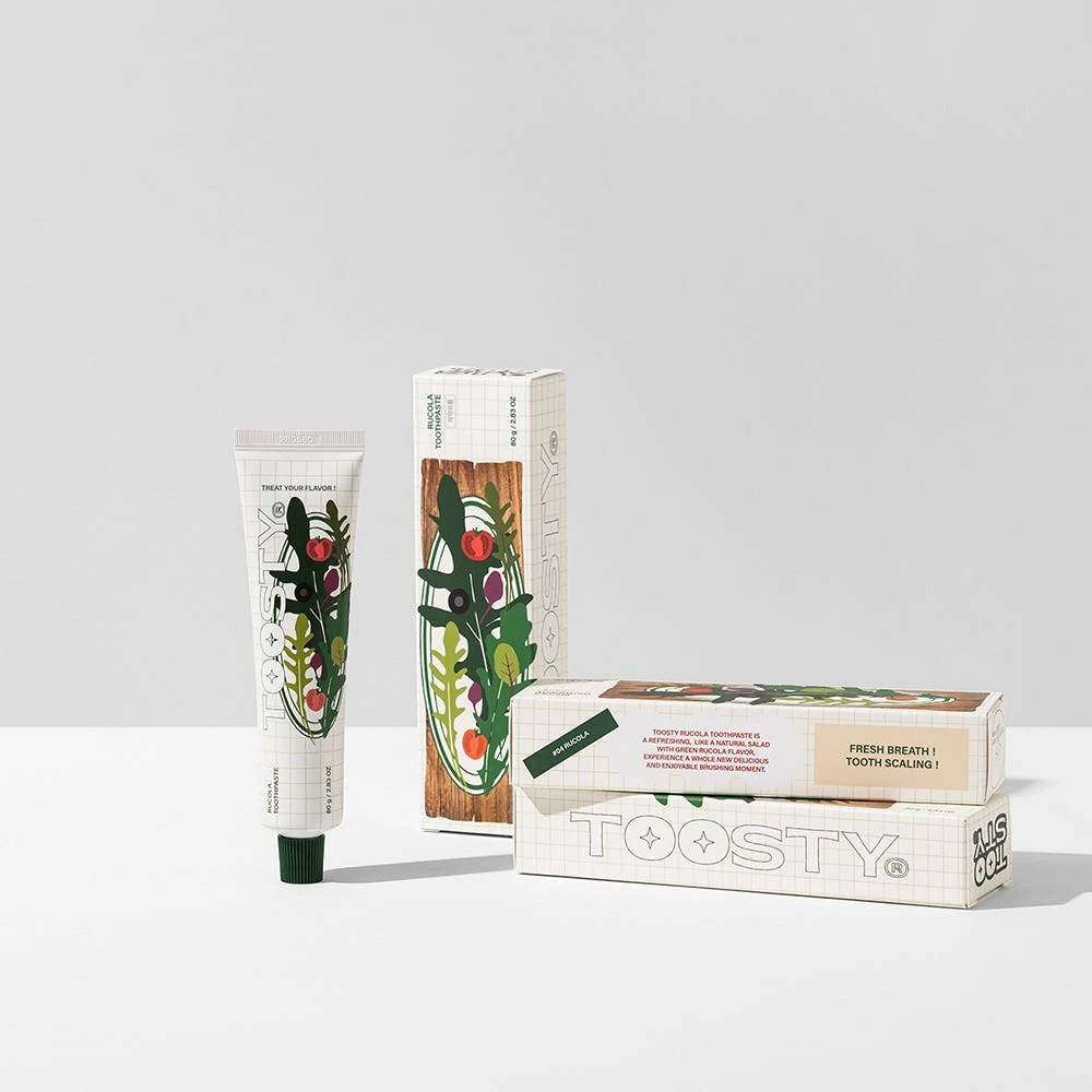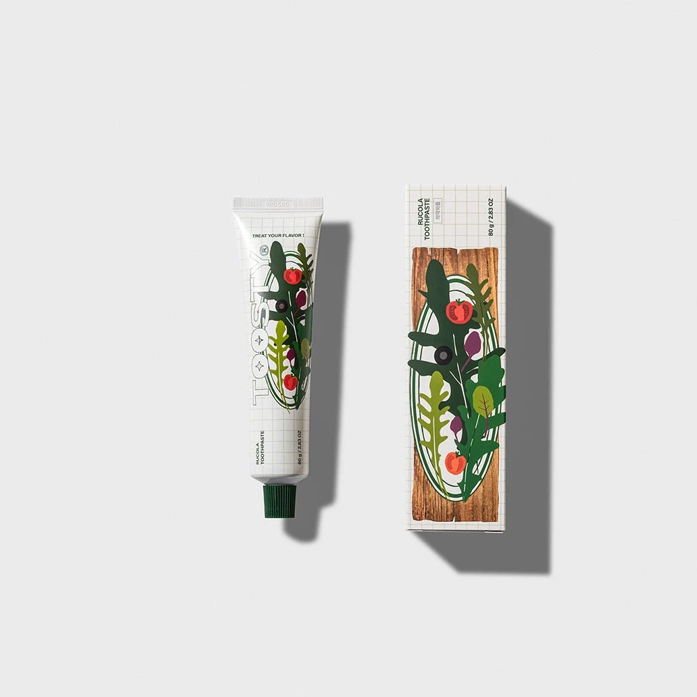 Die TOOSTY Rucola Toothpaste ist eine erfrischende und aufhellende Zahnpasta mit Rucola-Geschmack, die Karies vorbeugt. Diese innovative Zahnpasta mit Rucolageschmack ist ein wahrhaft einzigartiges Zahnputzerlebnis, das eine neue Art von Mundpflegeroutine definiert: eine Explosion von Frische und Sauberkeit wie nie zuvor. Diese Zahnpasta bietet einen unverwechselbaren Geschmack, der die Sinne weckt und ein anhaltendes Gefühl der Frische und Sauberkeit im Mund hinterlässt.Abgesehen von ihrem ausgefallenen und lustigen Geschmack ist diese Zahnpasta vollgepackt mit wichtigen Zahnpflegeeigenschaften. Ihre Formel enthält Anti-Karies-Wirkstoffe, die für ein starkes und gesundes Lächeln sorgen. Darüber hinaus entfernen ihre leicht bleichenden Eigenschaften sanft allfällige Flecken oder Verfärbungen auf der Zahnoberfläche.Diese Premium-Zahnpasta gehört zu einer Reihe von Zahnpflegeprodukten mit anders- und einzigartigen Geschmacksrichtungen.